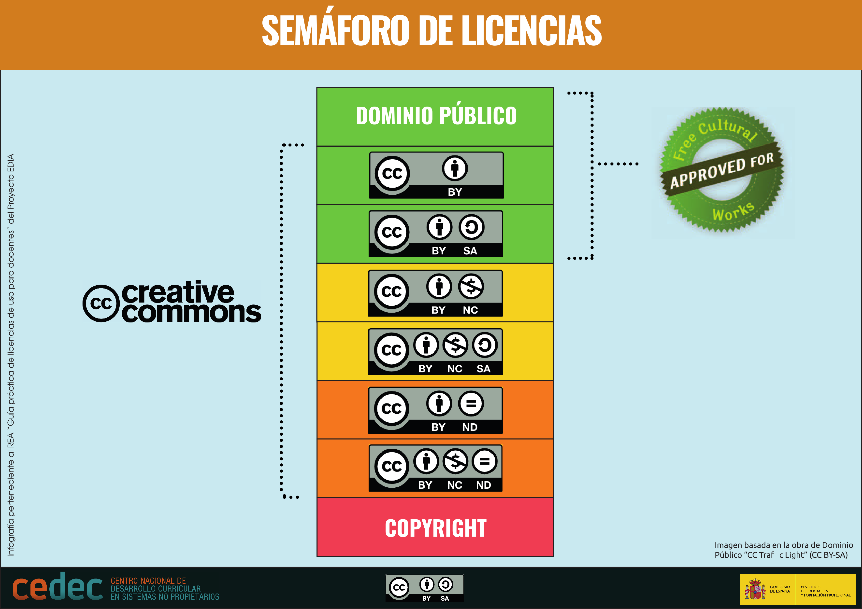 Como vimos anteriormente, os dereitos de autor reservan todos os dereitos de explotación dunha obra para o autor, no Dominio Público non hai dereitos de explotación reservados e as licenzas CC permiten ao autor decidir que dereitos de explotación cede e en que condicións. Isto permítenos debuxar o seguinte "semáforo de licenzas", no que se ordenan as licenzas desde a máis restritiva até a máis libre. Como se sinala na imaxe, as licenzas que cumpren os requisitos de "Obra de cultura libre", e por tanto recomendadas para a creación de Recursos Educativos Abertos, son CC BY-SA, CC BY e Dominio Público, porque permiten a máxima distribución da obra e, por tanto, do coñecemento.