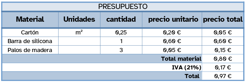 Antes de empezar, debéis calcular el coste que supondrá la ejecución del proyecto. En el presupuesto, solo se tiene en cuenta el material que se usa, nunca el coste de las herramientas utilizadas.