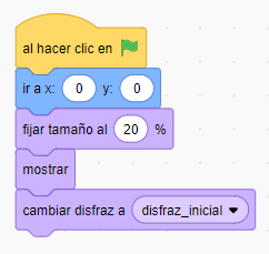 "Son bloques normales de Scratch y van justo después de un bloque de evento.  Pueden ser bloques de posición, de apariencia, de disfraz, de estilo de rotación, ... y que facilitan que el programa funcione bien después de su primera ejecución. "