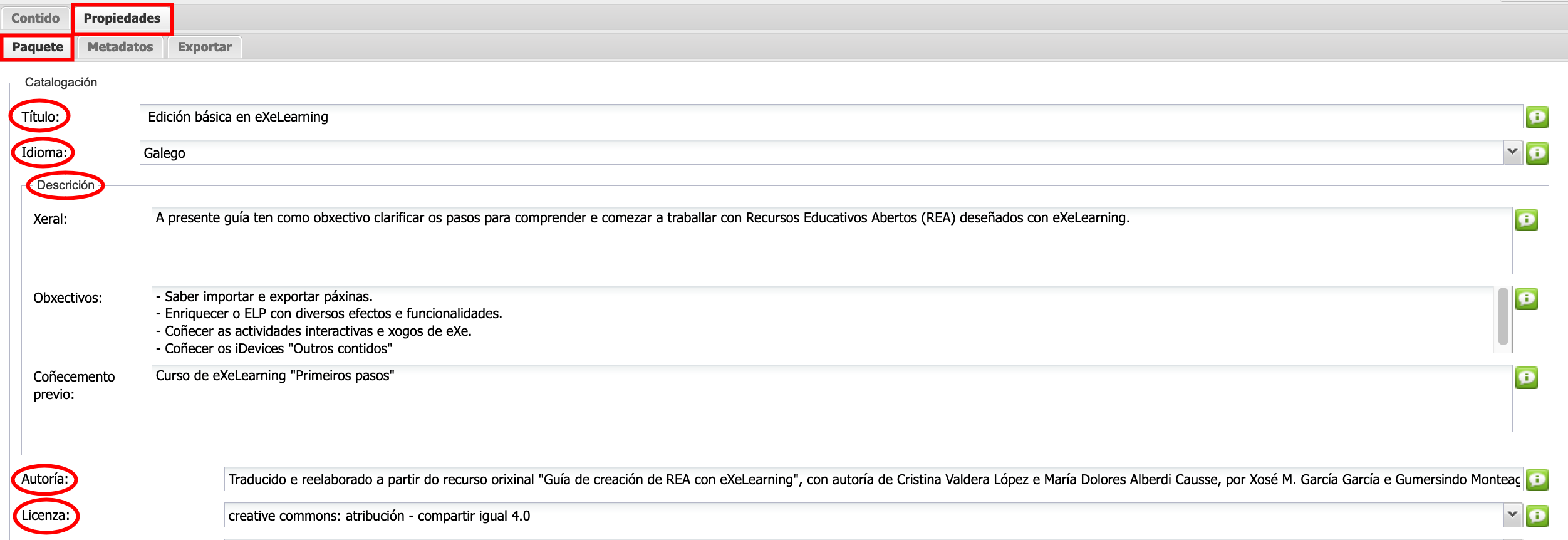 Recoméndase cubrir polo menos o título, o idioma, a descrición (polo menos a descrición xeral), o autor e a licenza. A continuación, na lapela Paquete, prememos en Gardar antes de saír se non queremos perder a información. Para os REA do proxecto cREAgal deberase cubrir, ademais, os campos indicados na Guía técnica e de deseño, no apartado 3.2. Catalogación en eXeLearning.