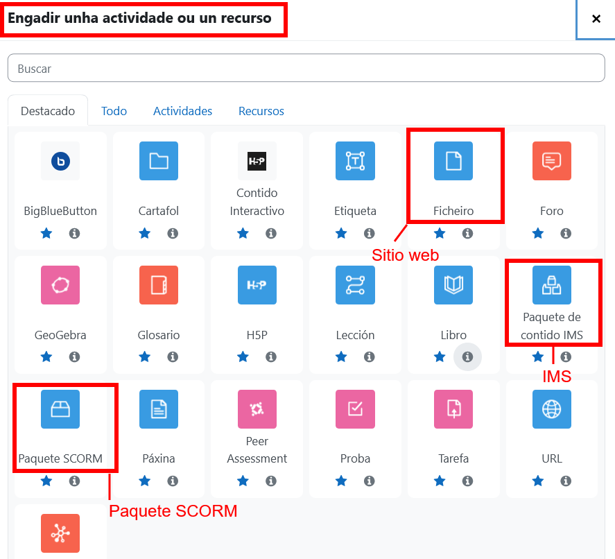 - IMS: se só queremos mostrar os contidos pero queremos que ese paquete manteña os seus metadatos ao subilo a Moodle.