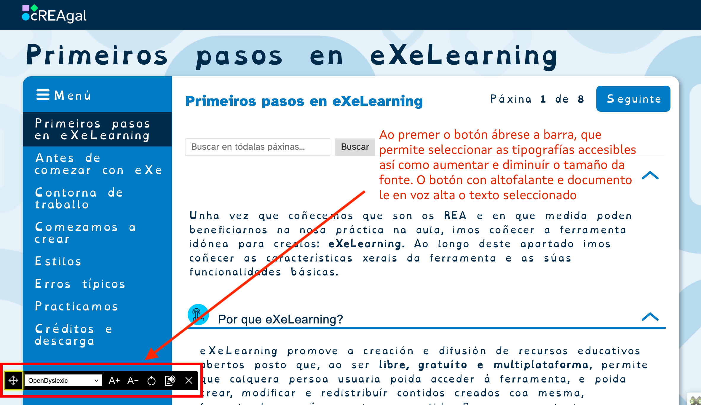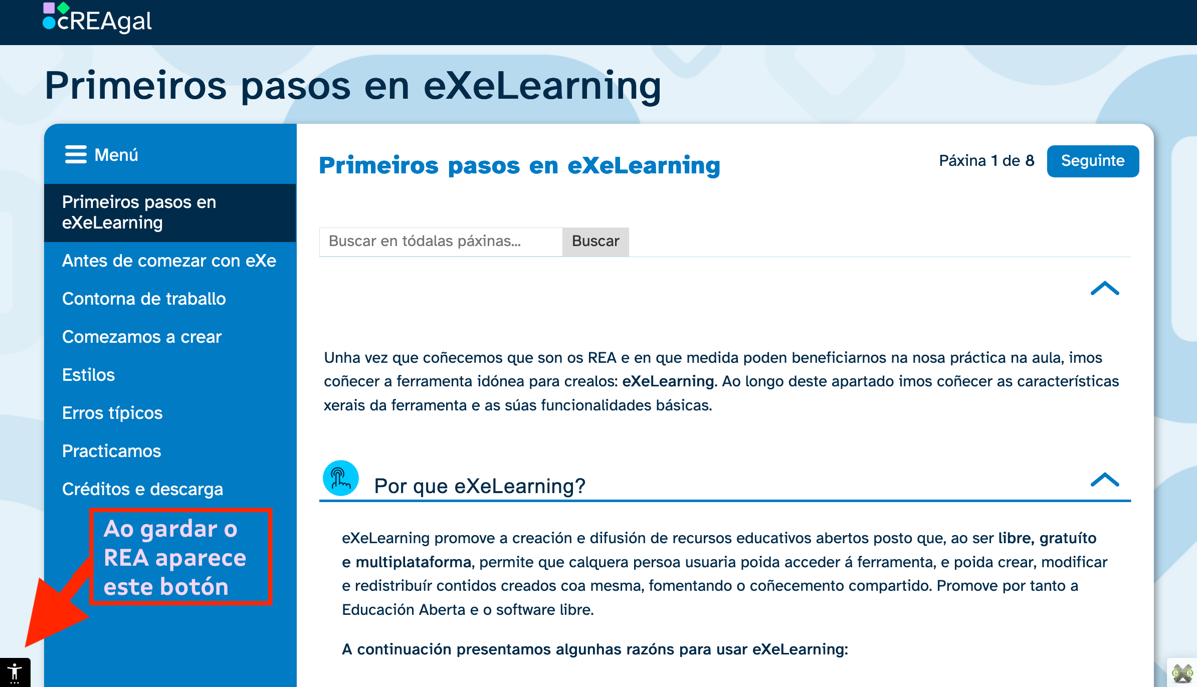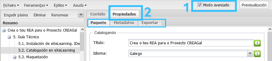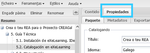 Para acceder ao catalogador dentro de eXeLearning debemos localizar a lapela “Propiedades”, situada á dereita de contido: