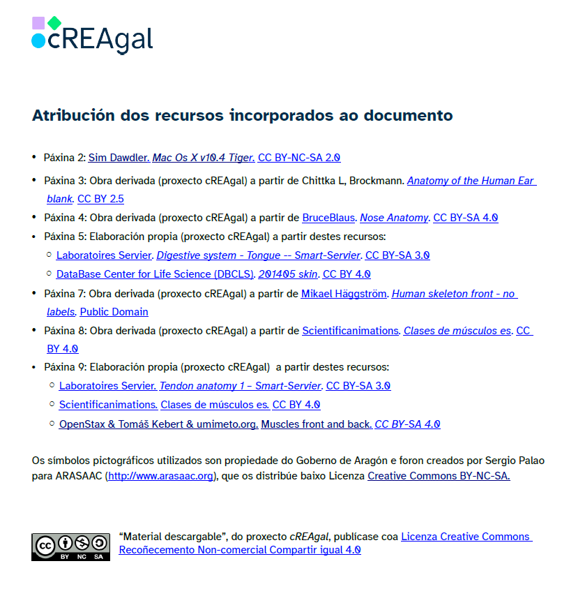 Para todo o material descargable, de xeito complementario á correcta atribución dos recursos na páxina de "Créditos" do REA, recolleremos tamén no propio documento a atribución dos elementos que incorpore.