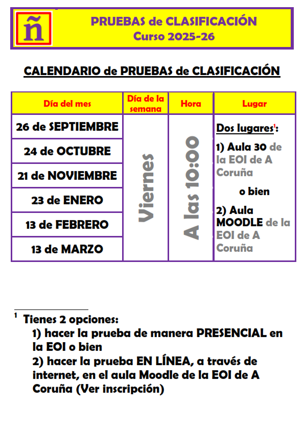 Si tienes algún problema para adjuntar la documentación necesaria, envía un correo electrónico a: eoi.corunha.matricula@edu.xunta.gal y en el Asunto (Subject) tienes que escribir "Prueba de Clasificación".
