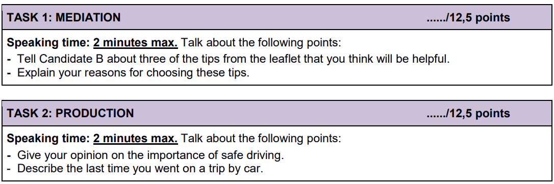 Preparation time for both tasks: 3 minutes. Maximum talking time: 5 minutes (2 mediation + 3 production)