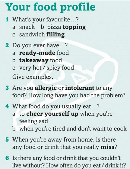 Now listen to six people answering one of the questions from the food profile section. For each person write the number of the question he/she is answering: