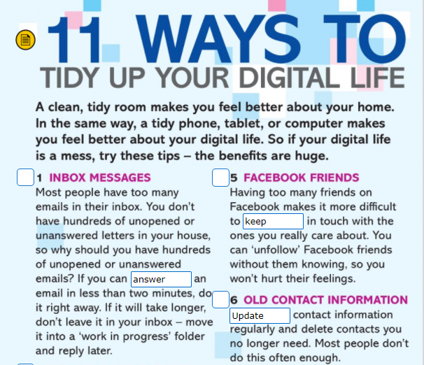 - Reading - Mediation: 11 ways to tidy up your digital life. Choose 3 of these tips you would consider your partner would benefit most from and in 2' maximum time, mediate them.