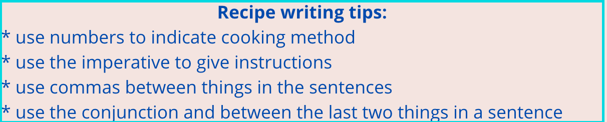 A cooking magazine is running a competition, asking its readers to submit a recipe for a suitable dish for a party. Write your recipe to present it in front of your classmates.