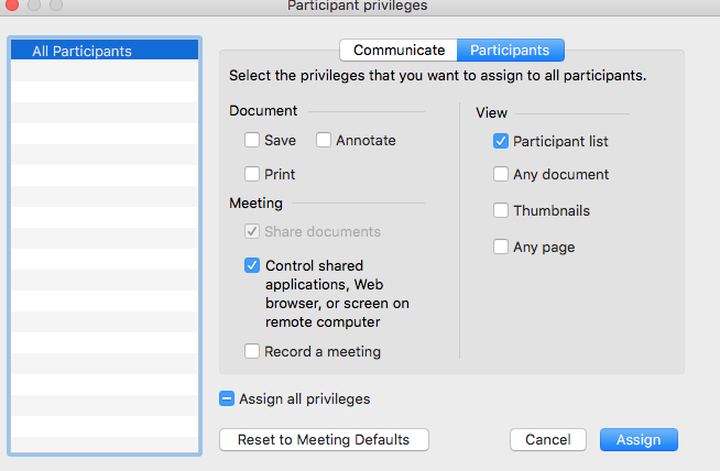 Para configurar esta opción, debemos ir ao Panel participantes, facendo clic co botón dereito no participante e, a continuación, seleccionando . Aparecerá un indicador de lápiz á dereita do nome do participante. Outra opción é seleccionar a opción de "Asignar privilexios", co que nos aparecerá unha fiestra como esta:
