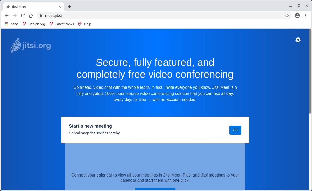 Podemos escribir o que queiramos en "Start a new meeting" e darlle ao botón "Go": as persoas que irán comunicar connosco soamente necesitan saber a palabra que escribimos para entrar na videoconferencia.