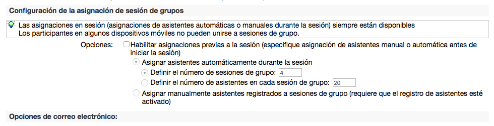 - Permitir a todos os asistentes comezar de xeito espontáneo sesións de grupo cos demais asistentes (non recomendado)