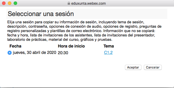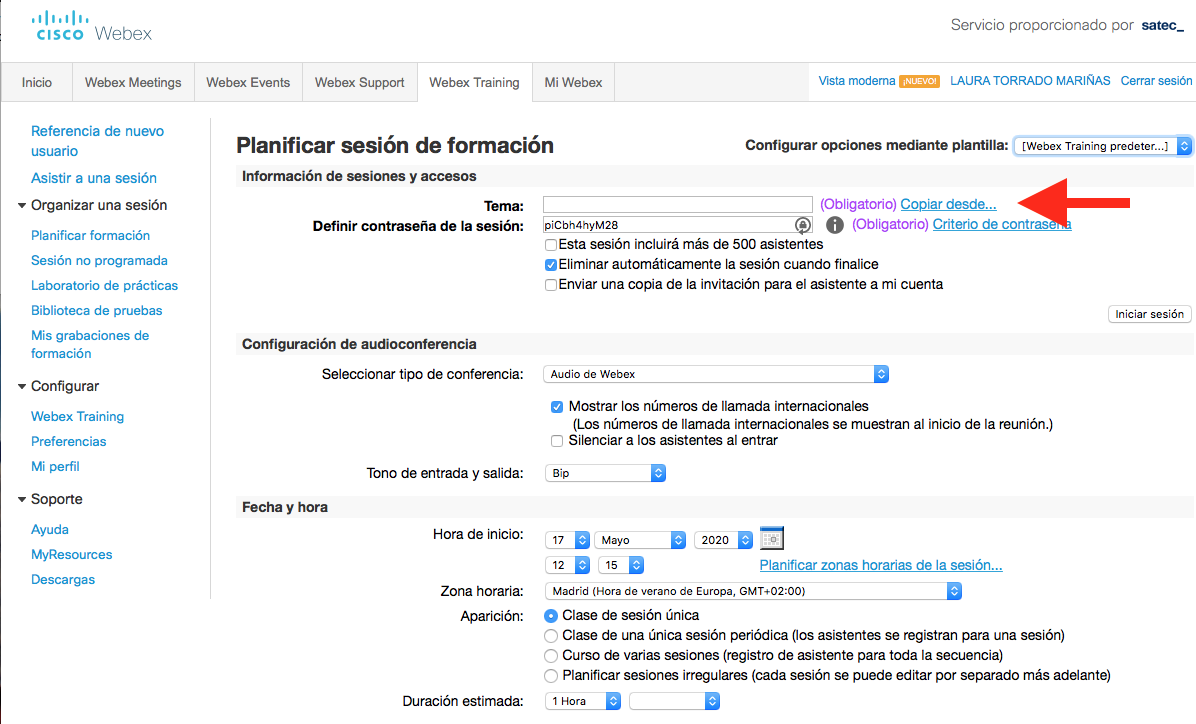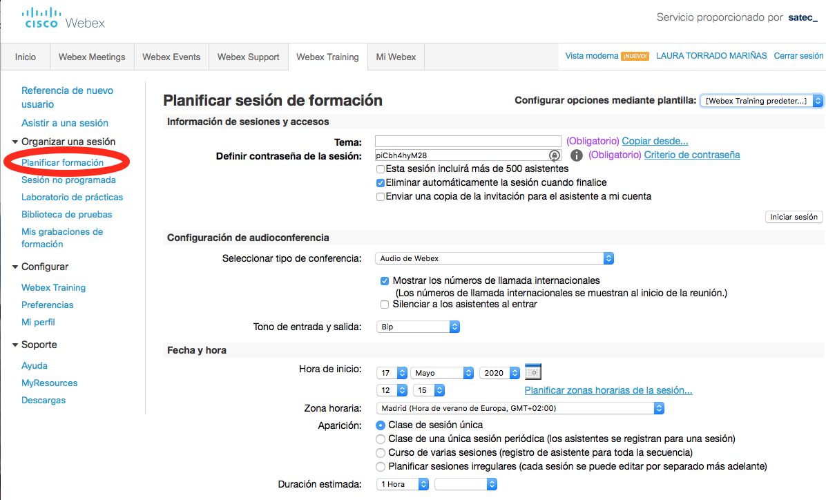 A planificación das sesións de capacitación programadas segue o mesmo patrón de configuración que o das reunións recurrentes en Webex Meetings, polo que se estamos familiarizados con ese proceso, non resulta complicado configurar a nosa sesión de capacitación recurrente.