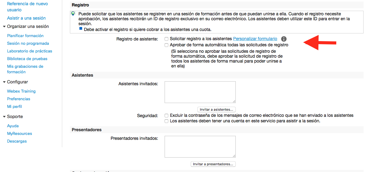 Unha vez rematada a configuración da temporalización sesión programada, pasamos as opcións de rexistro. Para isto, debemos seleccionar aos asistentes e decidir como van a poder acceder á nosa sesión. Tamén é o momento no que podemos decidir se queremos asignar un ou varios "presentadores", que terán privilexios distintos dos asistentes para, por exemplo, partillar material.