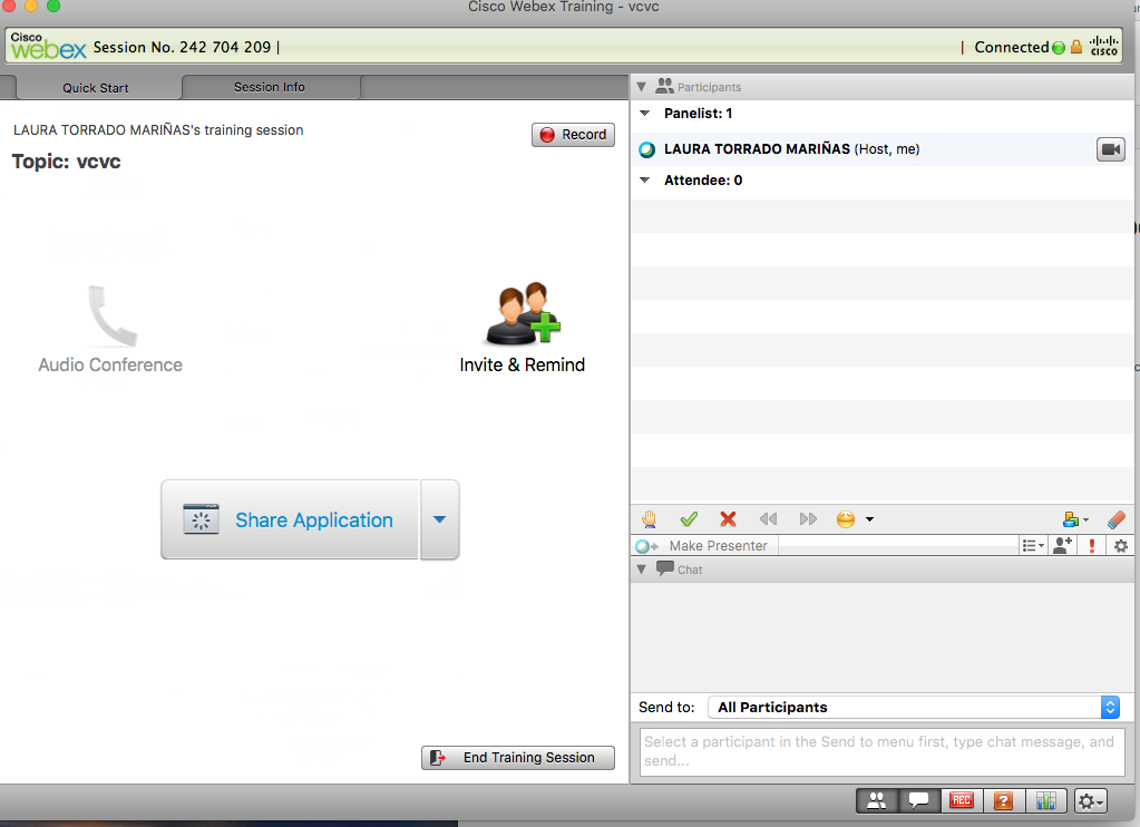 Unha vez configurada a nosa sesión de capacitación, poderemos acceder a ela. Como xa comentamos en apartados anteriores, a única desvantaxe de Webex Training é que a súa interface pode resultar un pouco máis árida, como se aprecia na seguinte imaxe: