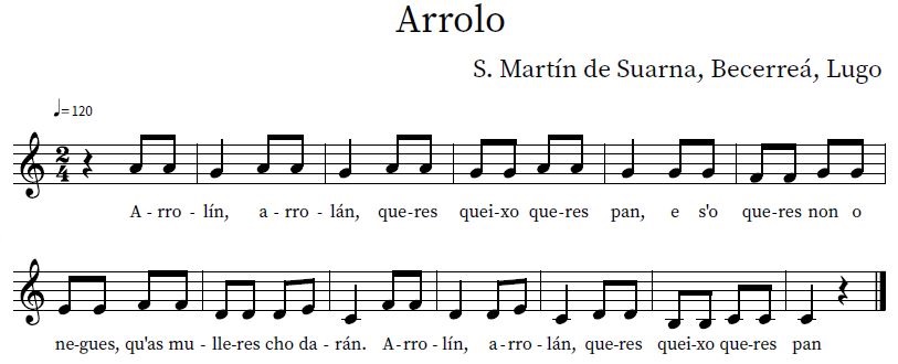 Ás veces cántanse os arrolos con melodías e métrica de xotas ou muiñeiras. Tamén se pode recitar cun ritmo de muiñeira: