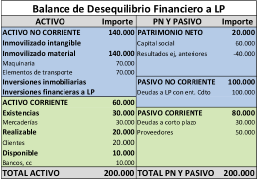 Independientemente del fondo de maniobra, cuando una empresa se endeuda en exceso y la estructura económica no es capaz de generar los suficientes recursos para hacer frente a las deudas y para solventarlo aumenta su endeudamiento, puede encontrarse en una situación de desequilibrio financiero a largo plazo. En estos casos es habitual que las empresas tengan pérdidas que hacen disminuir los fondos propios, lo que supone un riesgo de solvencia a largo plazo.