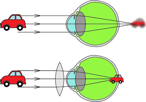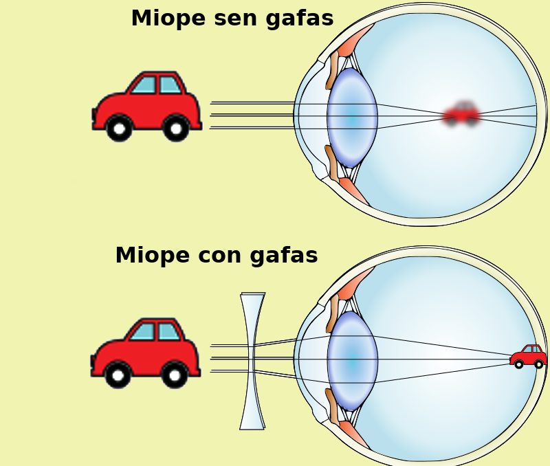 Como se pode ver na imaxe, o coche no ollo dun miope non se proxecta na retina, polo que se ve borroso.