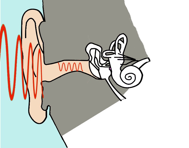 | 1ª.- As ondas sonoras que están no espazo son recollidas pola orella ou pavillón auditivo, e conducidas a través do conduto auditivo externo ata facer vibrar o tímpano. | ![]() |