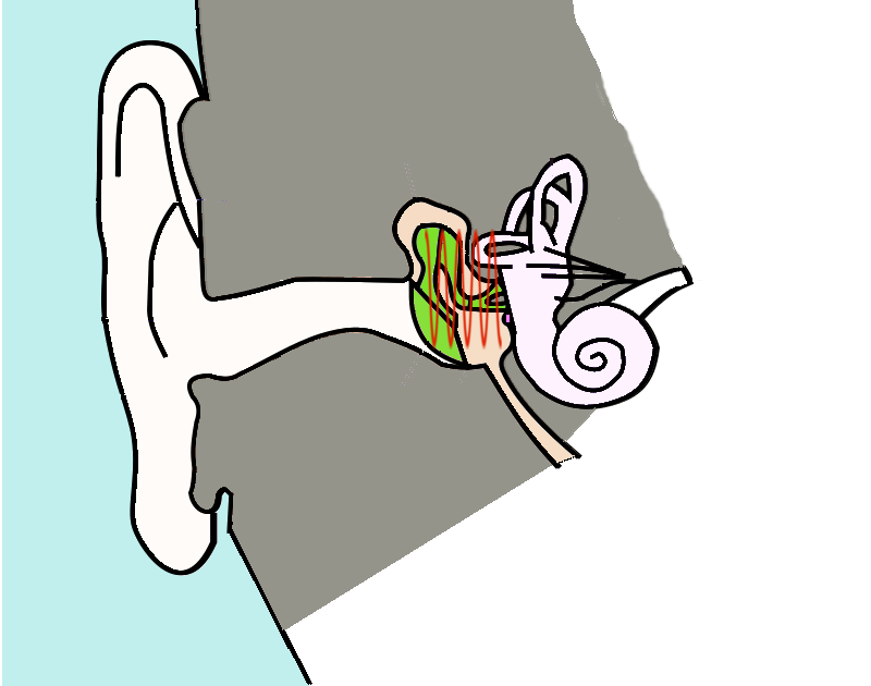 | 2ª.- O tímpano é como unha membrana dun tambor que ao vibrar move a cadea de osiños que hai no oído medío. O último dos osiños da cadea está unido ao caracol mediante unha ventaniña. | ![]() |