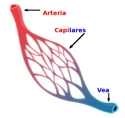 Capilares: Son uns condutos ou tubiños moi finos onde se produce o intercambio gaseoso de osíxeno e CO2. Son as conexións entre arterias e veas.