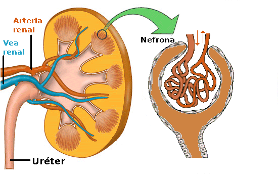 O sangue chega aos riles pola arteria renal que se reparte en distintas arteriolas para chegar a unha partes microscópicas dos riles chamadas nefronas nas que se filtra o sangue. As nefronas son coma cápsulas nas que entra o capilar sanguíneo facendo unha madeixa.