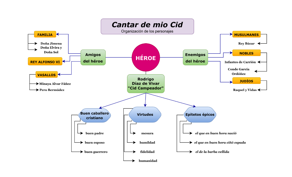 Se trata de personajes planos, sin apenas profundidad psicológica. Todos los personajes del Cantar se pueden agrupar en torno al héroe, figura principal protagonista, tal y como vemos en el esquema siguiente.