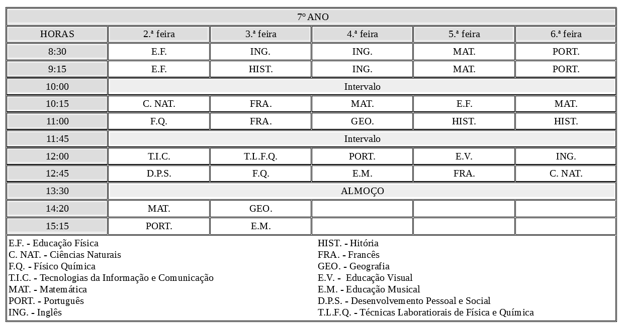 São dois colegas da turma do 7º ano. Estão na sala de convívio e um dos dois não tem o horário da turma completo. Pede ajuda ao outro. Façam o diálogo com ajuda do horário :