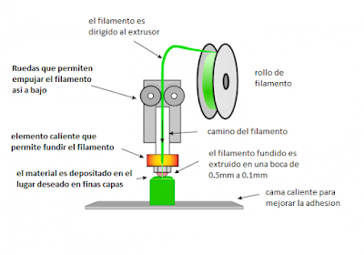 Su funcionamiento es muy básico: tenemos un rollo de filamento del que un cabezal extrusor va cogiendo el material, lo calienta hasta fundirlo, y lo va depositando poco a poco para generar la pieza que queremos crear. El proceso de creación de piezas en este tipo de dispositivo sería más o menos así: