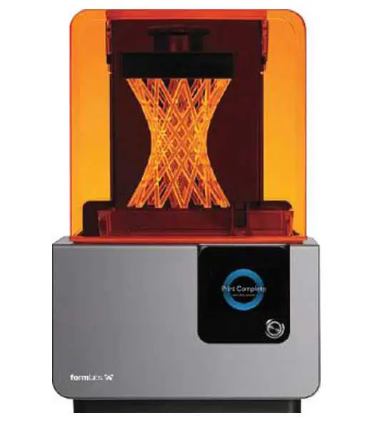 Tenemos un tanque lleno de resina.La impresora baja o levanta la plataforma de impresión según necesita, creando una capa delgada de resina. El láser UV dibuja el patrón de una sola capa en la resina, haciendo que se solidifique. Una impresora 3D de resina tarda también bastante tiempo en crear una pieza utilizable, y tiene la desventaja de que incluso cuando ya ha terminado de «imprimir», hay que curar la pieza (generalmente metiéndola en otro dispositivo de curado que la cubre de luz UV para hacer que se termine de solidificar del todo).