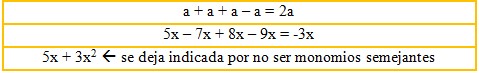 Los monomios solamente se pueden sumar (o restar) cuando son semejantes, es decir, cuando tienen la misma parte literal. Se suman (o restan) los coeficientes y se pone la misma parte literal. Cuando no son semejantes, la operación se deja indicada.