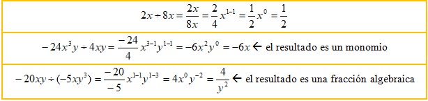 El cociente de dos monomios da como resultado una expresión algebraica que va a tener como coeficiente el cociente de los coeficientes, y como parte literal el cociente de las partes literales. El resultado no tiene por qué ser un monomio.