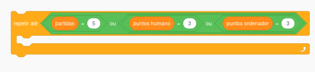 Neste exemplo o bucle que escollemos vai repetirse ata que suceda unha das seguintes condicións: pasaron 5 rondas, ou un dos dous xogadores alcanzou os 3 puntos e polo tanto gañou a partida. Como ves usamos un bloque OU para facer isto.