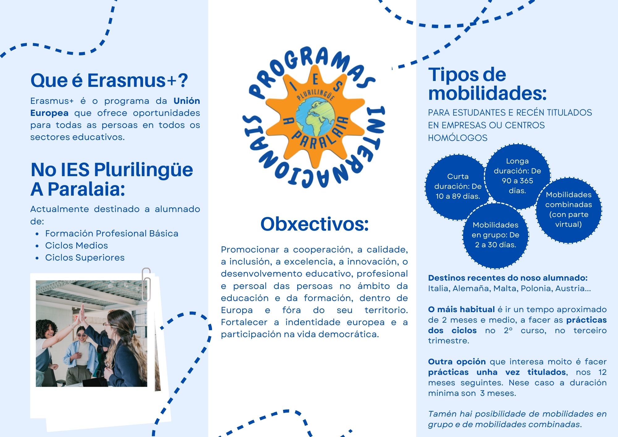 O alumnado do centro pode facer mobilidades de curta duración, máximo 89 días, para realizar formación en empresa, é dicir, prácticas nunha empresa en outro país, ou mobilidades de longa duración, unha vez titulados (duración de 3 a 12 meses). No ciclo superior este curso foi a primeira vez que ofertamos outro tipo de mobillidades en ciclo superior, de curta duración para estudos, non para prácticas. De cara aos vindeiros cursos, queremos aumentar a oferta, que o alumnado se anime máis a vivir esta experiencia, e estamos tratando de organizar outros tipos de mobilidades, por exemplo, en pequenos grupos, para visitar centros con ensinanzas formativas similares as nósas.