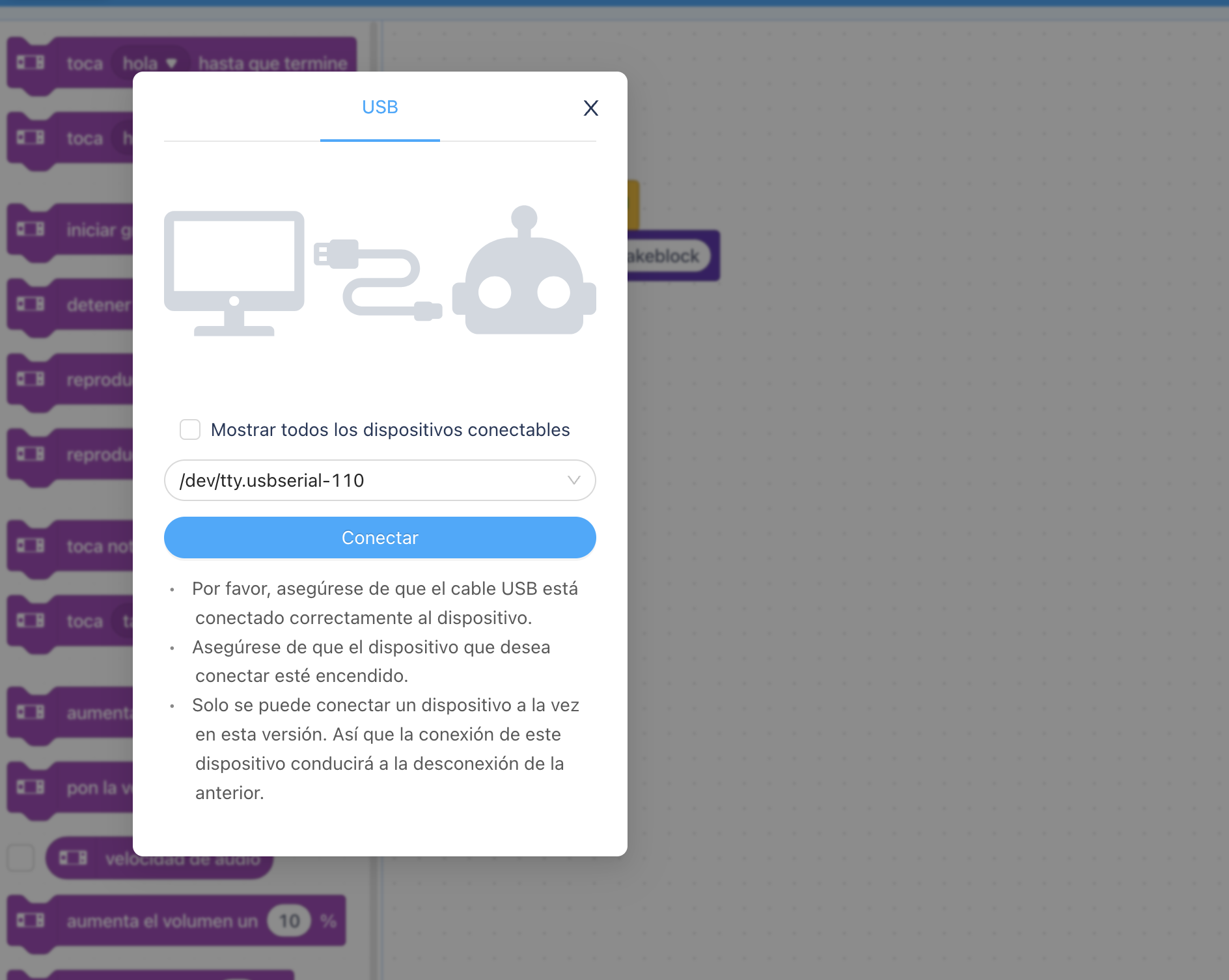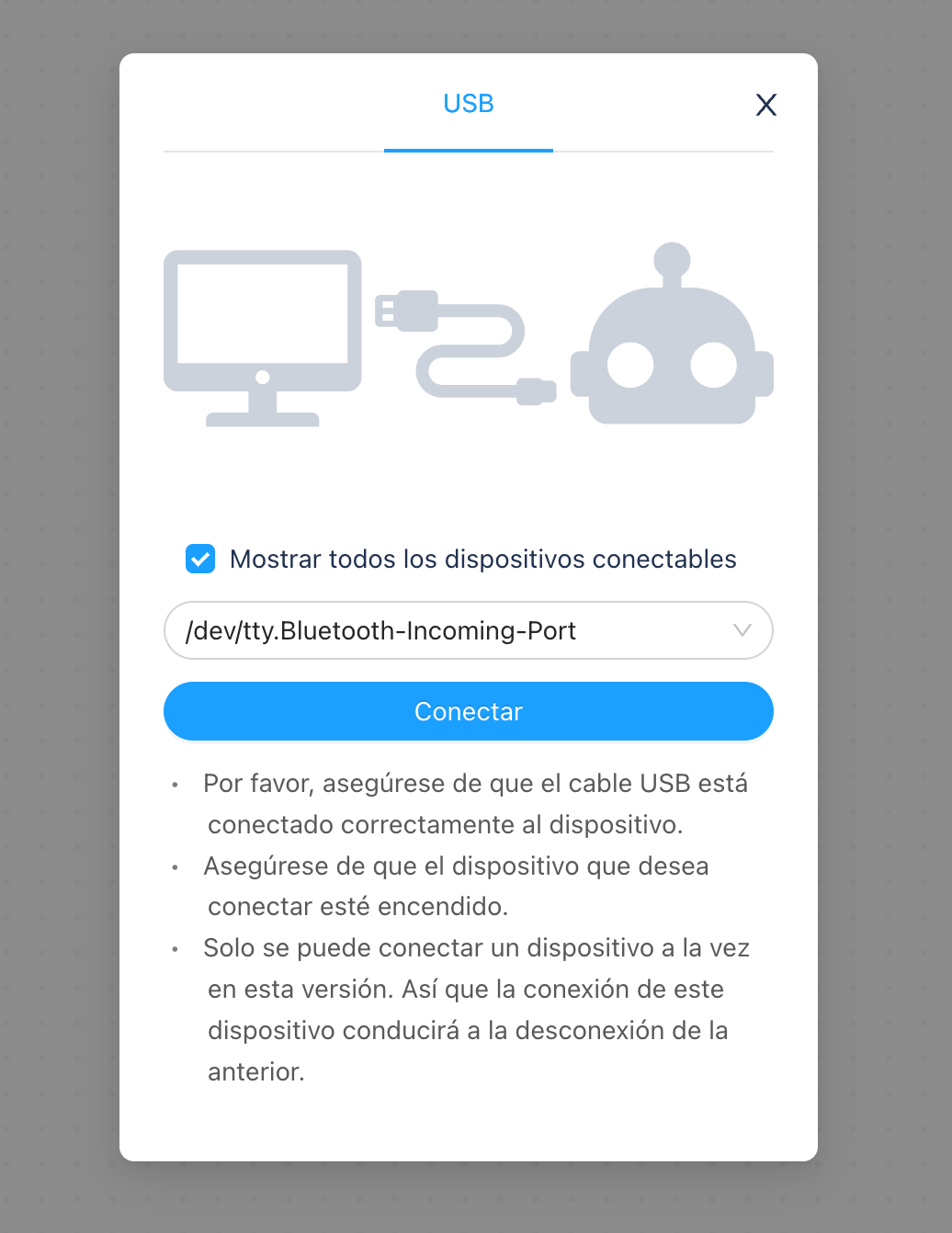 Es probable que aunque solo aparezca el apartado USB, seleccionando "Mostrar todos los dispositivos conectables" aparezca un dispositivo relacionado con el bluetooth. Se puede probar si el robot responde a esta selección. Se muestra imagen.