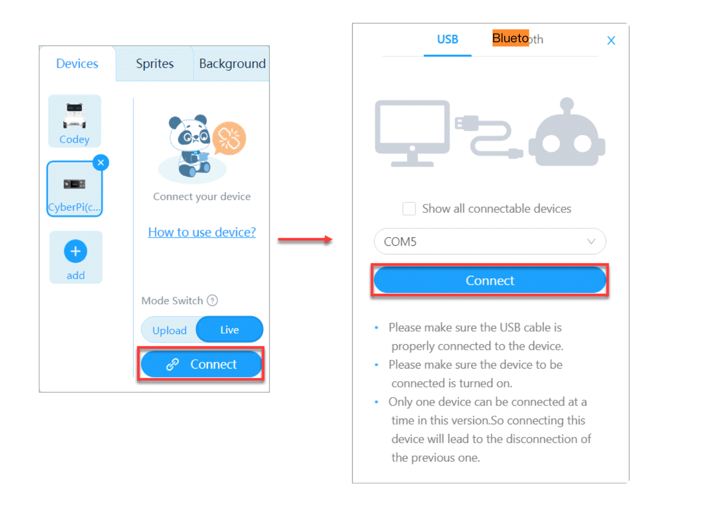 - Darle a conectar en la aplicación y seleccionar algo que haga referencia al bluetooth o al USB. Esto variará en función del sistema operativo que se tenga.