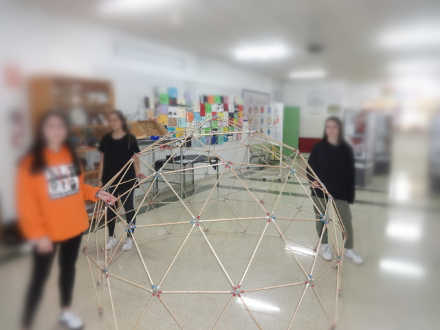 Para construir la cúpula geodésica de frecuencia 2 a partir de un icosaedro, se dividen sus aristas por la mitad y se proyectan los vértices sobre la esfera.