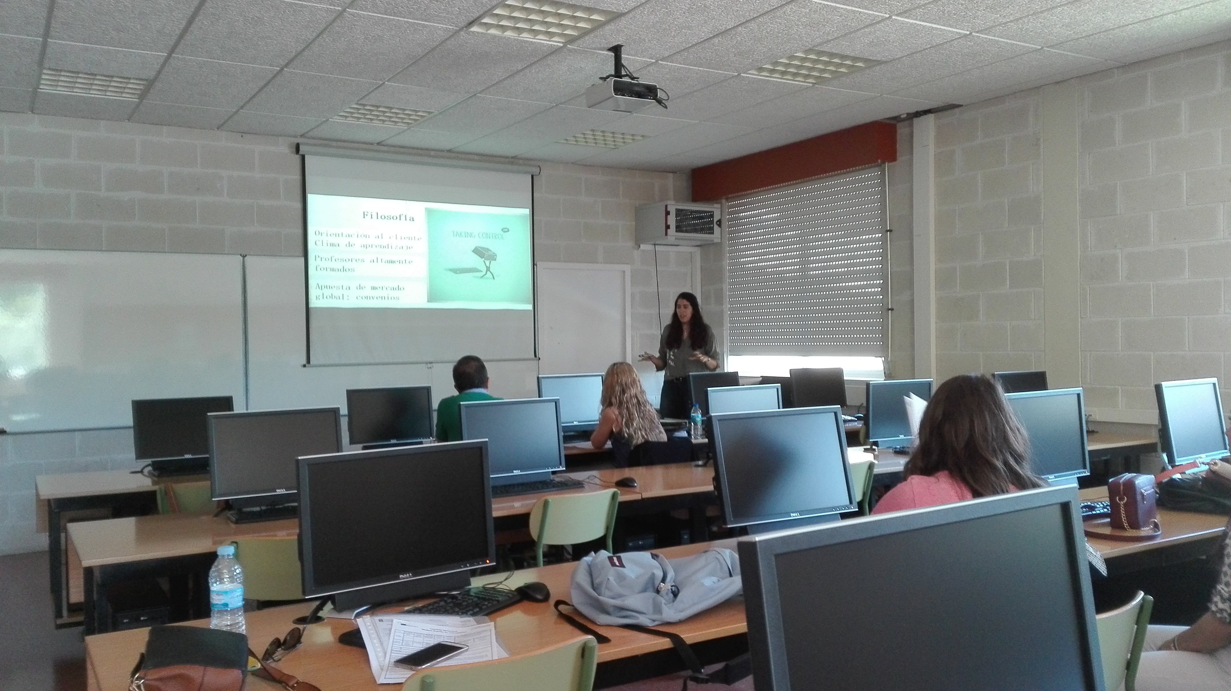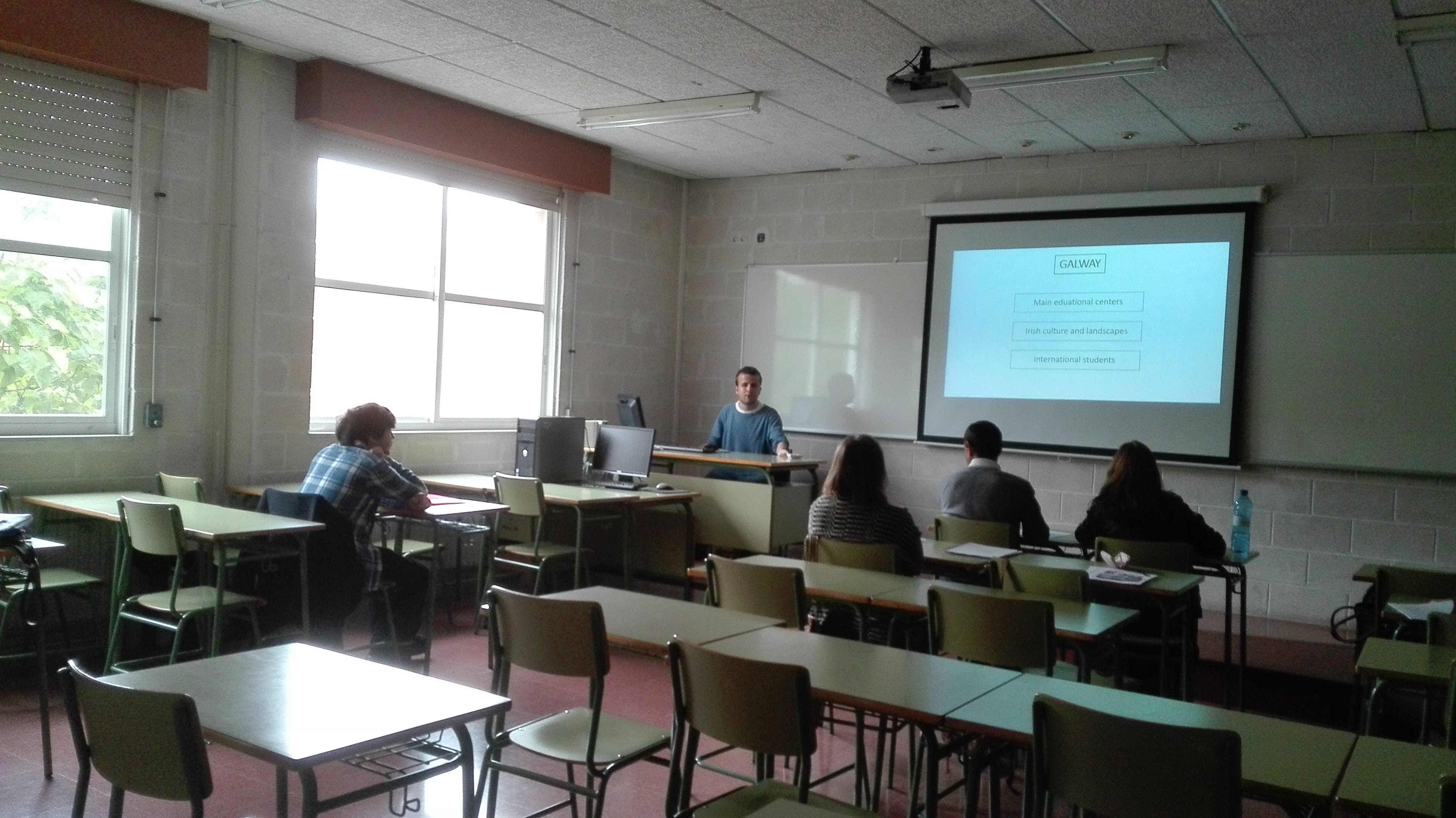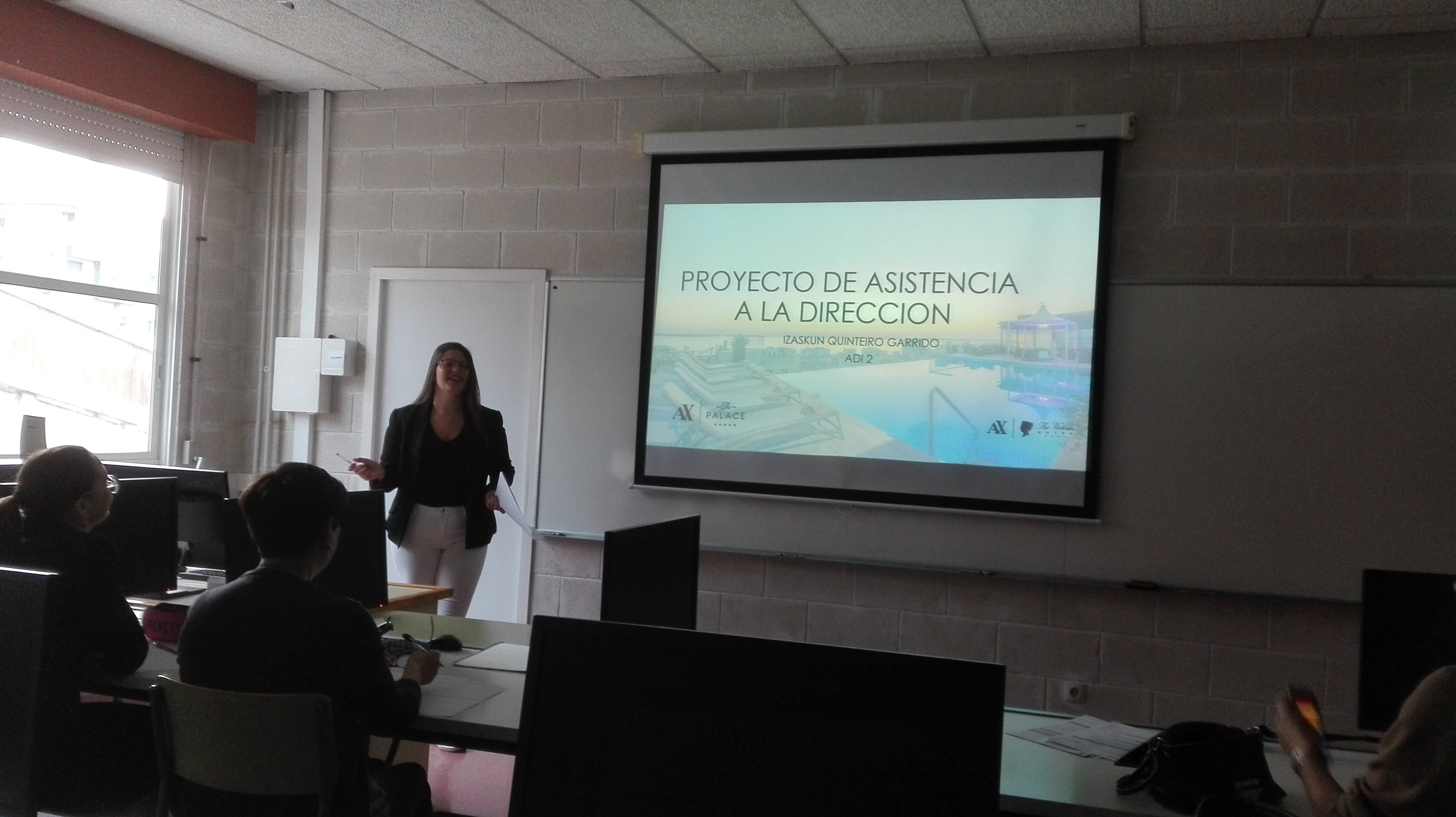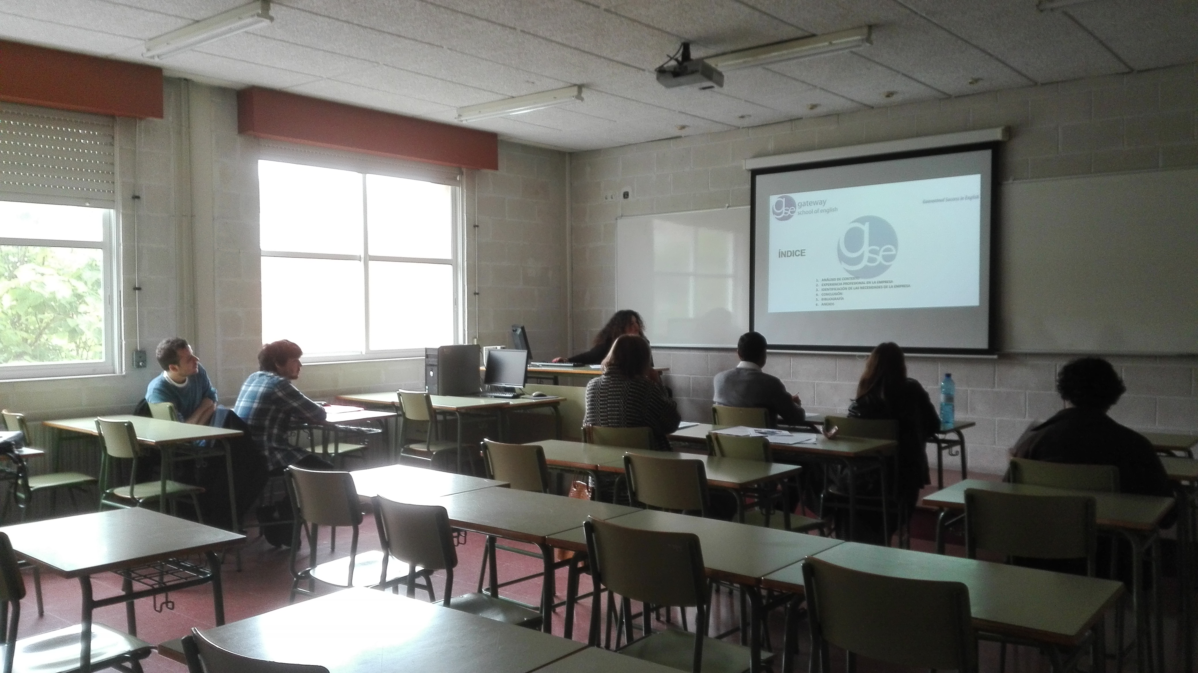 Foto de Susana de la Iglesia presentando o seu traballo de fin de grao en Administración e Finanzas aos compañeiros e profesores despois de rematar un período de prácticas Erasmus+ de tres meses na empresa Atlantic Language en Irlanda.