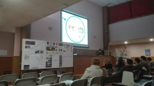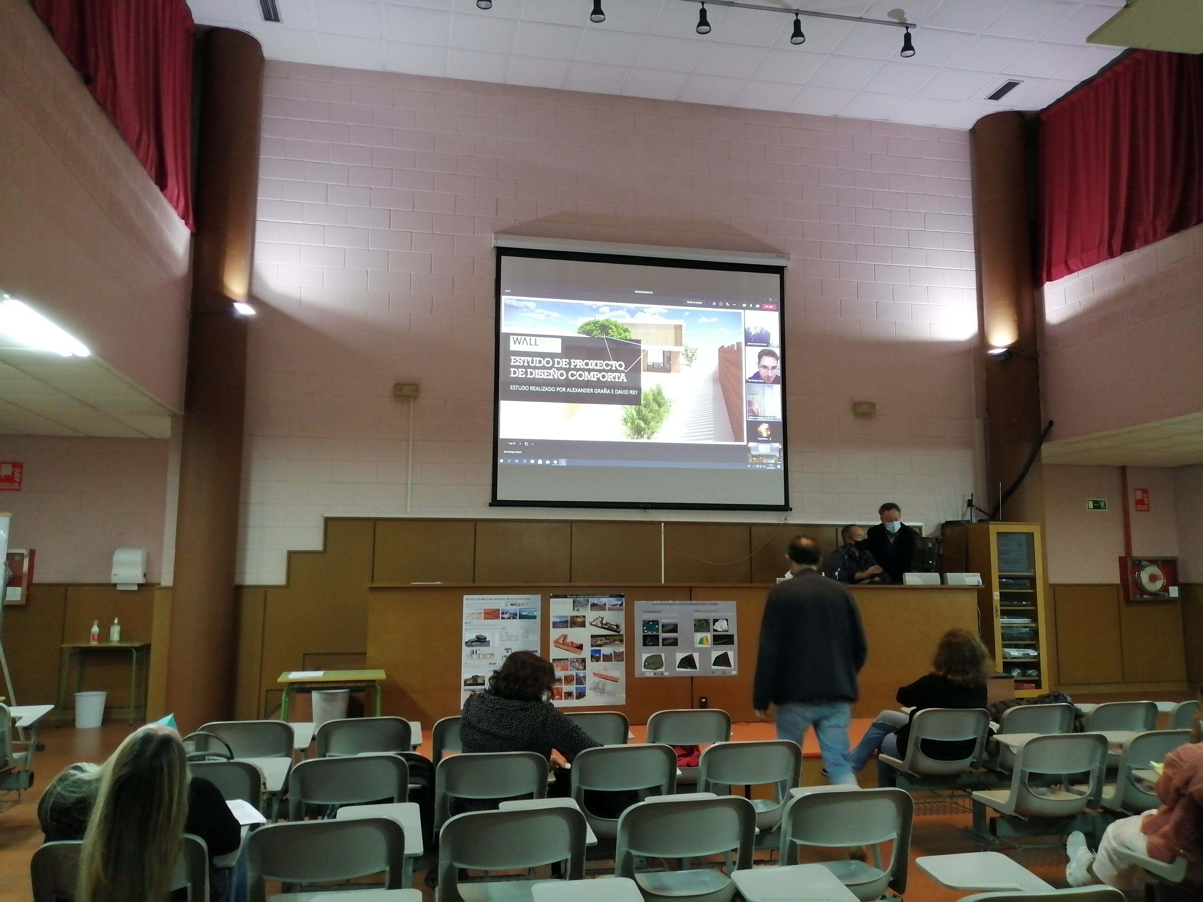 Foto de Ivo Rivero presentando o seu proxecto de fin de grao (Proxectos de edificación) no salón de actos do centro despois das súas prácticas de tres meses en Holanda cunha beca Erasmus+. Ao acto acudiron compañeiros, profesores e familiares do alumnado.