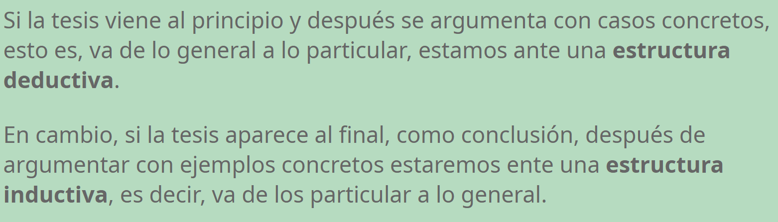 - Deductivo: se lanza la tesis al inicio y, a continuación, se deducen sus argumentos.