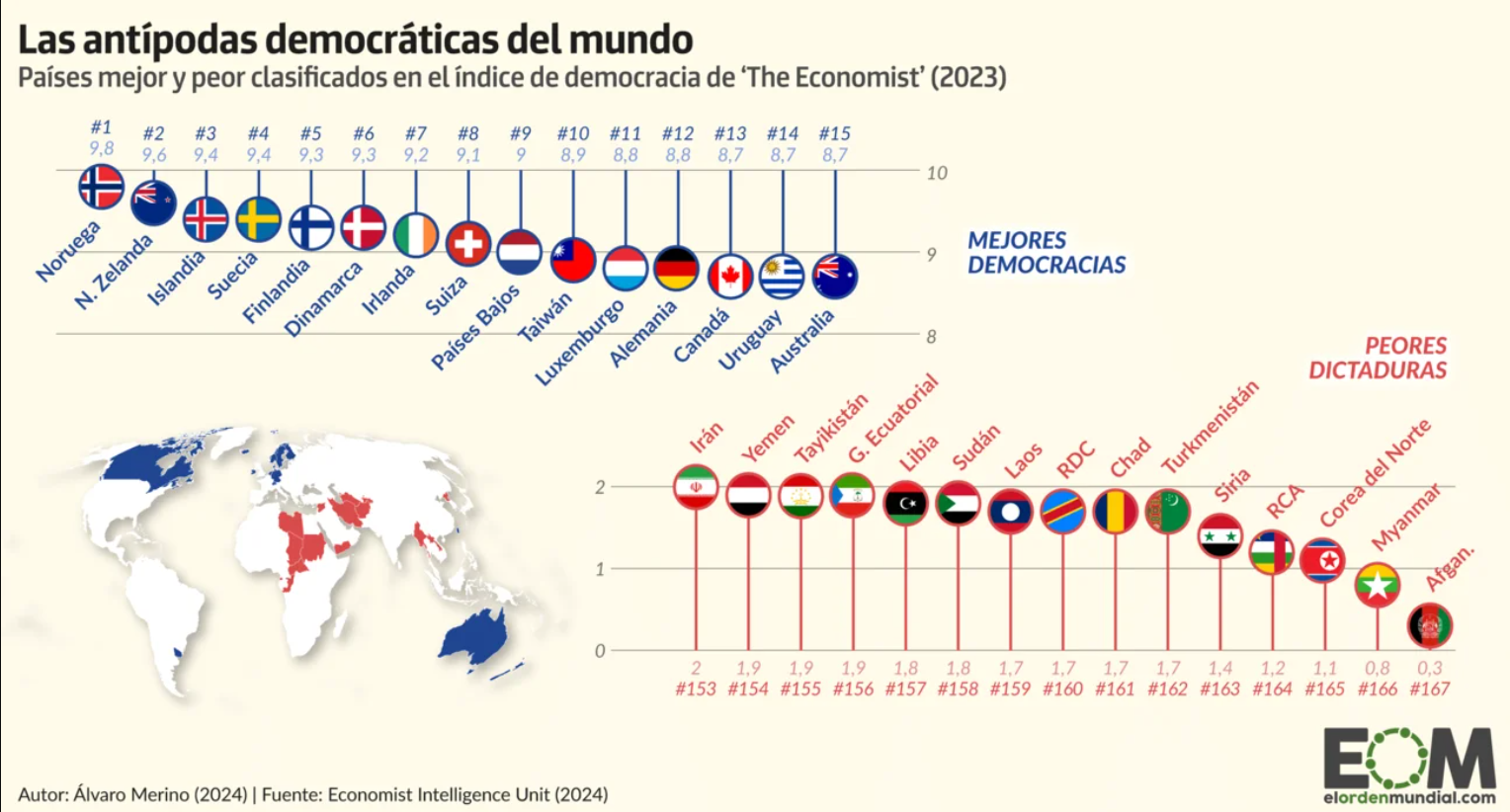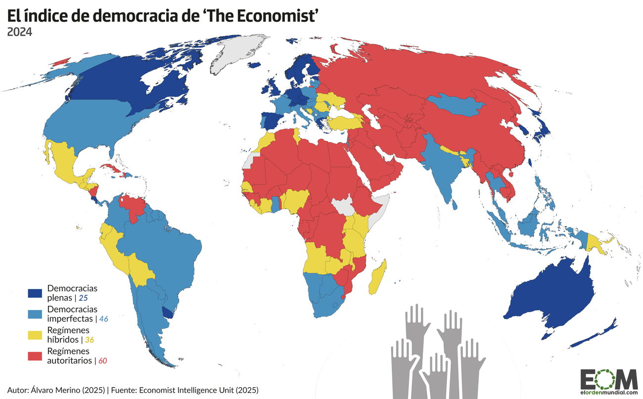 O Índice de Democracia clasifica 167 países e territorios en catro categorías: democracias plenas, democracias imperfectas, réximes híbridos e réximes autoritarios, baseándose en cinco criterios: proceso electoral e pluralismo, funcionamento do goberno, participación política, cultura política e liberdades civís.
