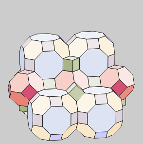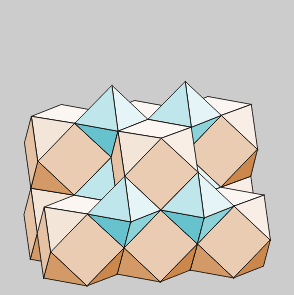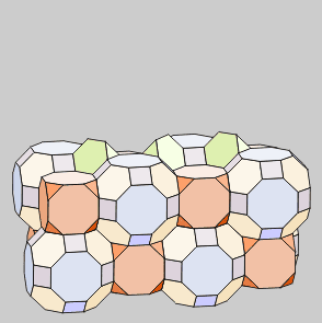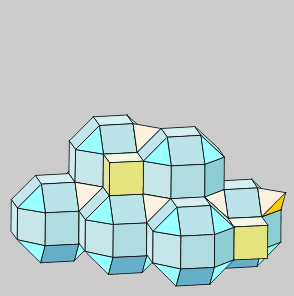 Los Teselados o empaquetamientos son combinaciones de poliedros capaces de cubrir completamente el espacio tridimensional. Las condiciones que deben cumplir los poliedros para formar agregados son: tener las aristas de la misma medida, tener algún tipo de cara igual y tener ángulos diedros susceptibles de combinarse para sumar 360º. Del mismo modo que con pentágonos no se puede teselar el espacio plano, el Dodecaedro, el Icosaedro y sus derivados no participan en los empaquetamientos. En la práctica, los poliedros combinables son el Tetraedro, Hexaedro, Octaedro y otros no regulares derivados de ellos. |