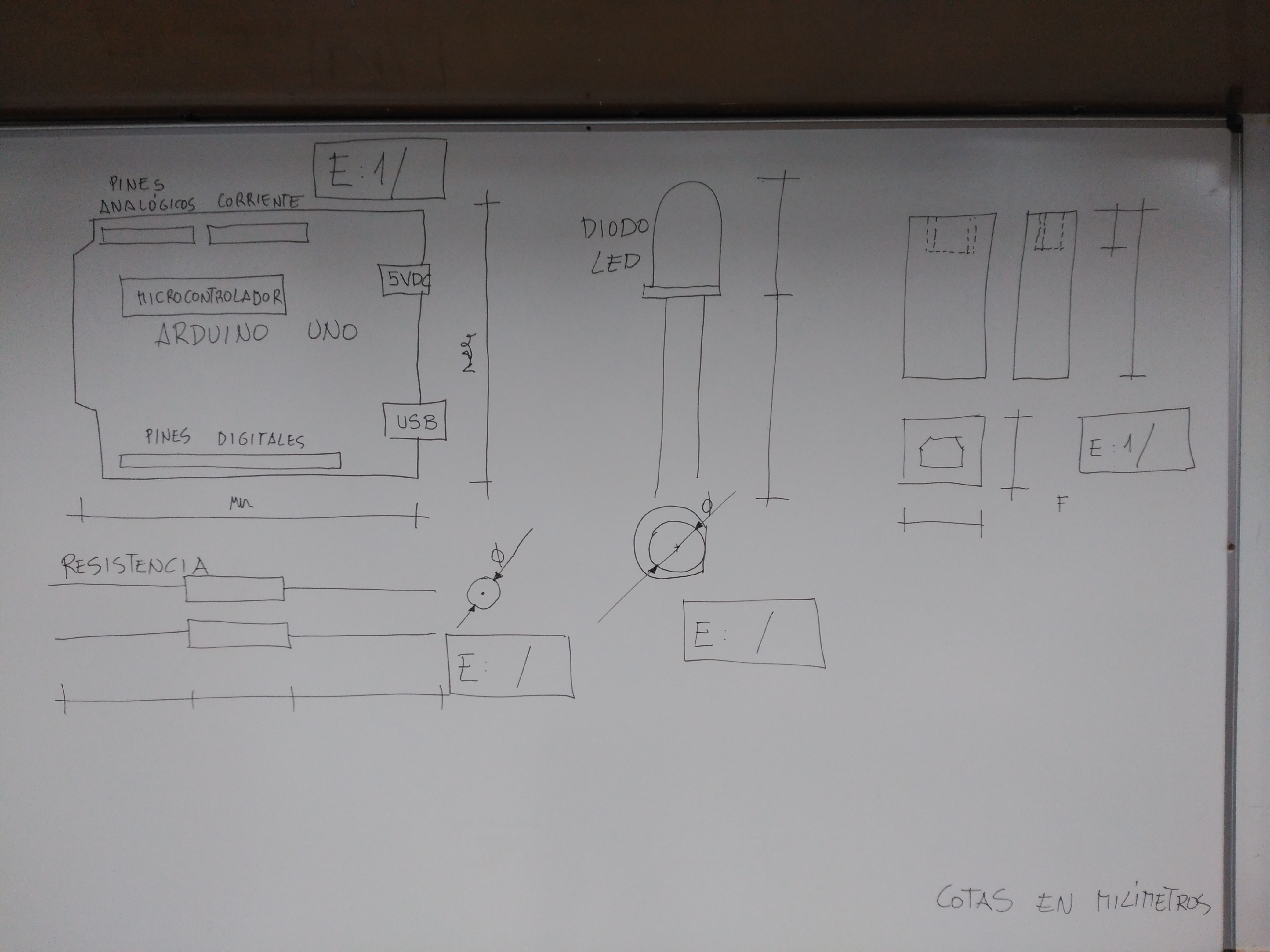 Una vez realizada la ficha teórica de mediciones con Calibre o Pie de Rey ya pasamos a manejarlo en la realidad, en este caso para medir y acotar (Normas de Acotación, Editorial Anaya) los elementos eléctrico-electrónicos a emplear en nuestro proyecto de curso sobre una ficha que ya cuenta con las representaciones a escala.