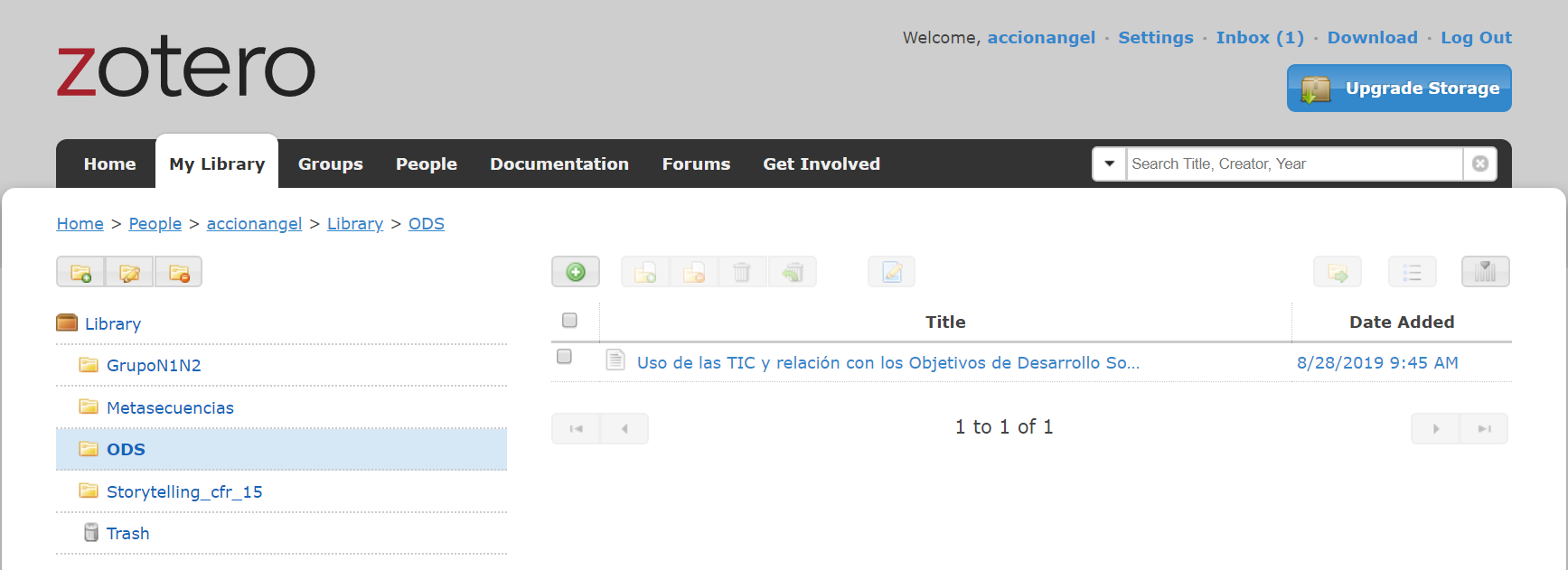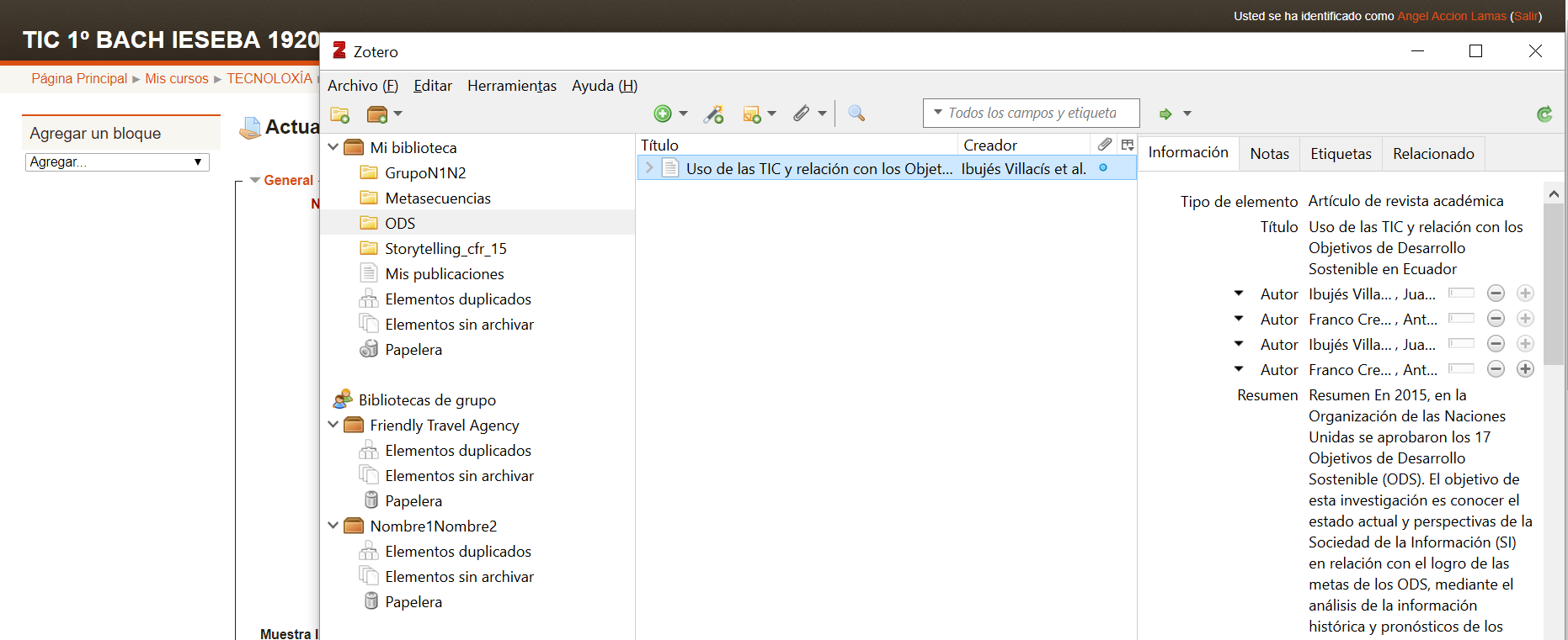 La siguiente imagen corresponde a la captura de pantalla de mi primera referencia guardada en Zotero y su clasificación en la etiqueta ODS de Library. El archivo Captura_Zotero_AngelAcción (98 KB) está guardado en mi carpeta personal de Drive compartida con el profesor de nombre AcciónLamasAngel_TIC_B1X19.