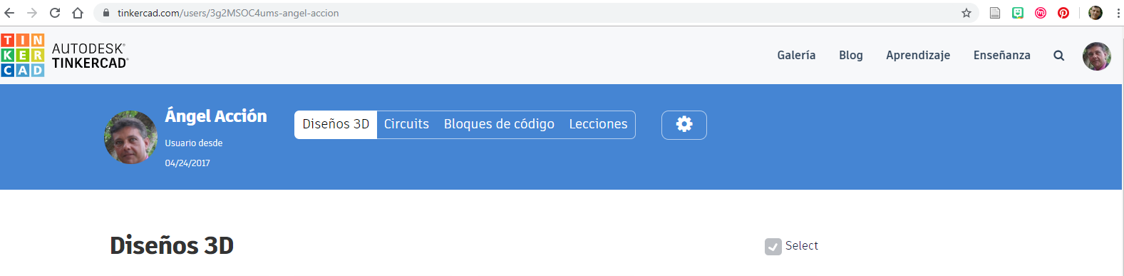 Regístrate en Tinkecad y envía el enlace a tu cuenta, la url se parecerá a la mía: https://www.tinkercad.com/users/3g2MSOC4ums-angel-accion porque el nombre que he puesto en el perfil es Angel Acción.