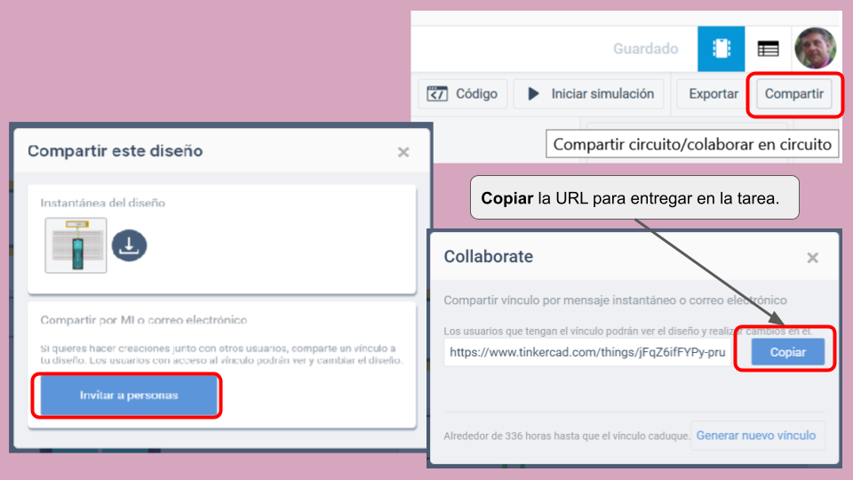- Las URL de los anteriores enlaces serán las obtenidas luego de clicar en Compartir (arriba-derrecha) - Invitar a personas del Circuito en Tinkercad. Cualquier otra url no funcionará y no se podrá calificar la tarea: calificación CERO.