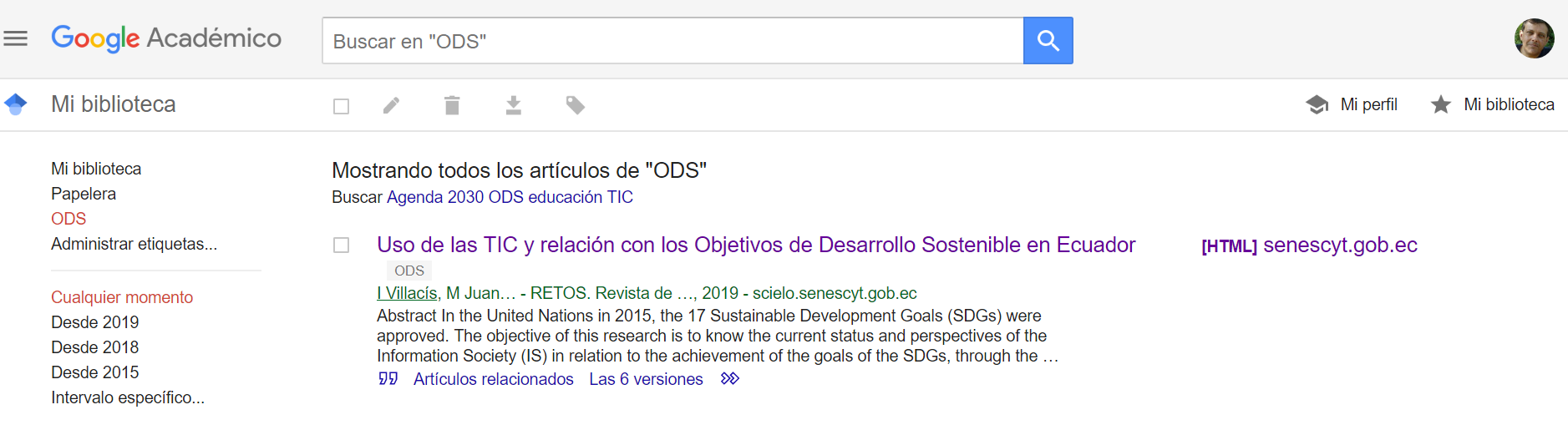 Utiliza Google Académico para realizar una búsqueda con los términos: ODS, Agenda 2030, TIC y Educación. Elige un recurso y guárdalo en tu biblioteca dentro de la etiqueta "ODS".