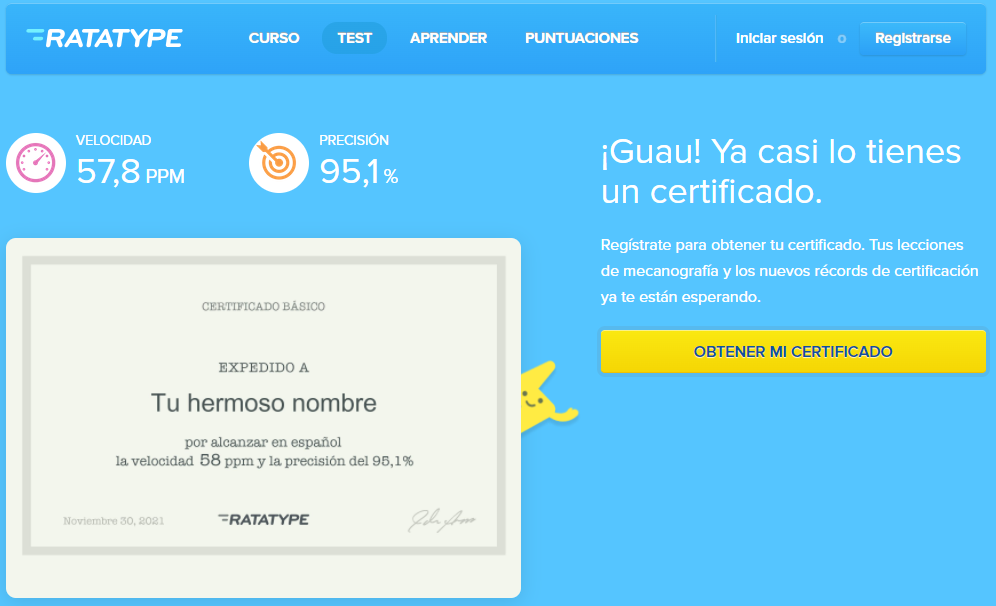 Una vez hayas terminado, o antes si te atreves, puedes comprobar tu velocidad con el siguiente Test de Mecanografía Online, y cuando lo termines (un par de minutos) obtendrás un certificado (anónimo si no te has registrado) como el siguiente:
