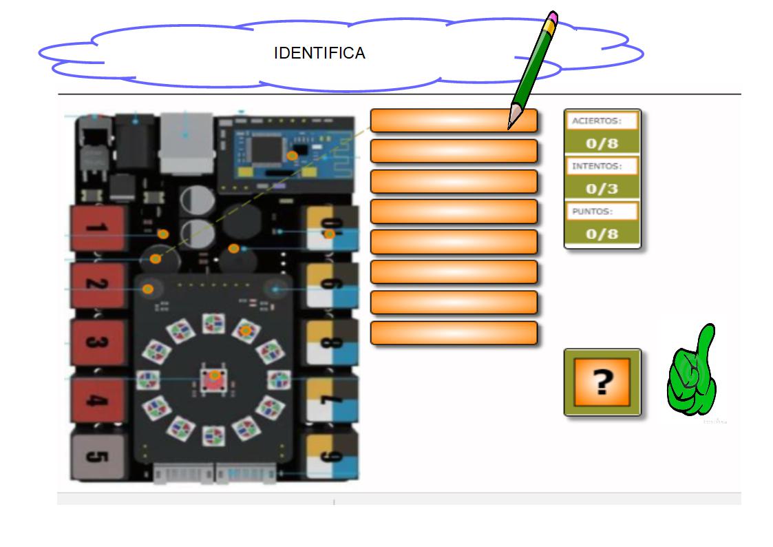 Con esta actividad comprobarás si sabes todos los nombres de los componentes del robot. Se muestran una serie de imágenes y tienes que emparejarlo con el nombre que corresponda. Cuando lo encuentres presiona la interrogación.
