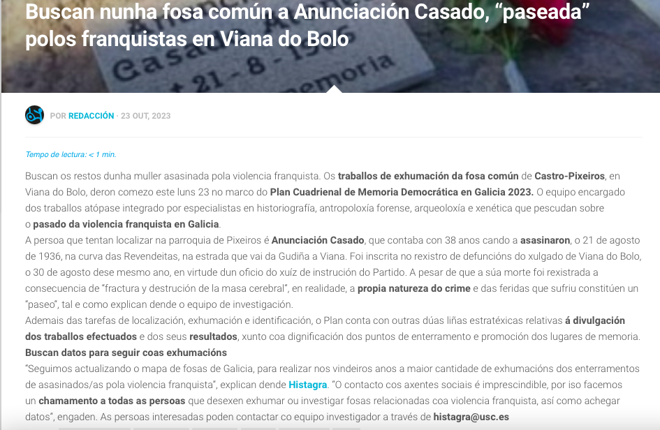 É unha noticia publicada na versión dixital de Nós diario o 4 de xullo de 2024. O emisor é a xornalista autora, Susana Rois, que se dirixe a un público maioritario cunha linguaxe sinxela e directa, propia dun texto divulgativo. Faino cun uso correcto do código, a lingua galega, e nun rexistro formal adecuado ao contexto.