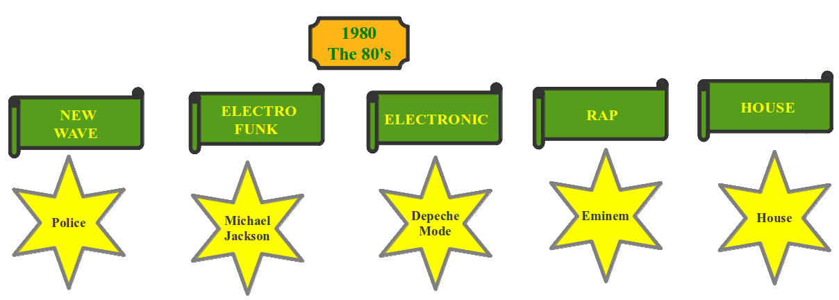 | In the 80's the music industry was expanded. Video Music appeared. ![]() ![]() ![]() |